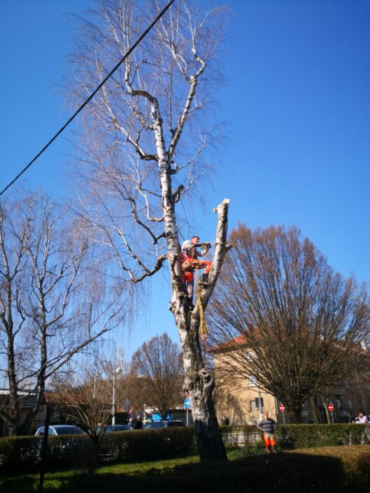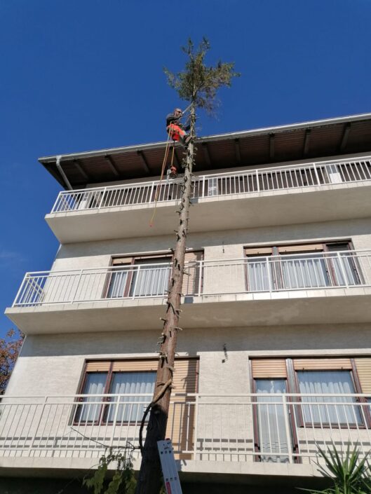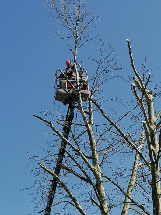 Koristeći pomoć dizalice, specijalnog alata i opreme za visinski rad uspijevamo s drveta spustiti granu po granu.